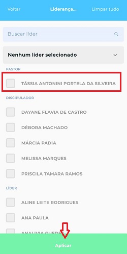 👉 <mark style="color:blue;">**3º:**</mark> Escolha a pastora, discipuladora ou líder e clique no botão verde ***Aplicar Filtros***.&#x20;