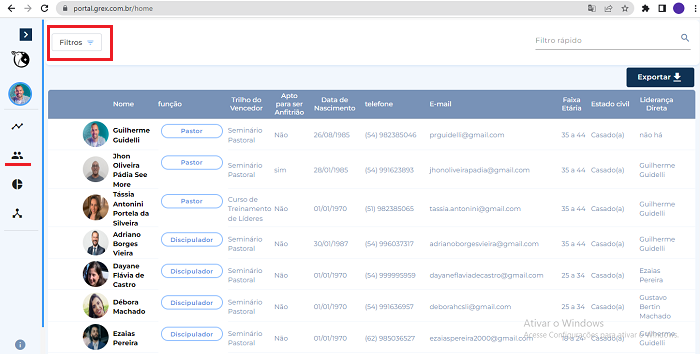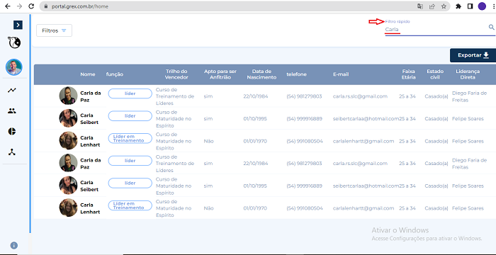 👉 **4º:** Se você deseja apenas filtrar uma pessoa pelo nome, é possível utilizar o ***filtro rápido***. No canto superior direito onde tem uma lupa, digite o nome desejado.&#x20;