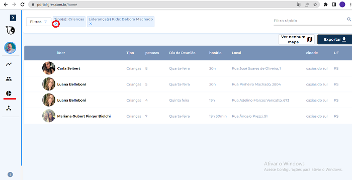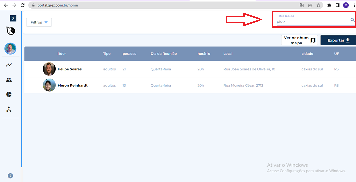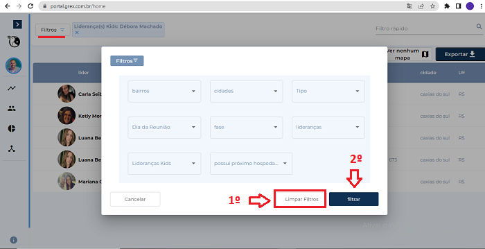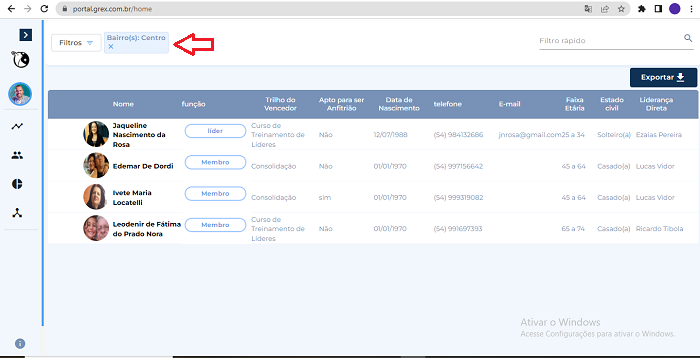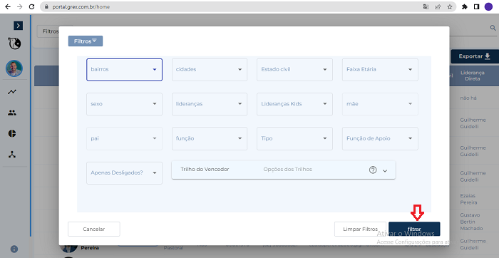 👉 **2º:** Em seguida escolha os filtros que deseja aplicar, por exemplo: quero ver somente as pessoas que moram no bairro centro, e clique em ***Filtrar***.